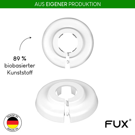Wir sind der größte Rosettenhersteller Deutschlands und produzieren den Großteil unserer Rosetten selbst. Seit 1962 stehen wir für Qualität und Innovation in der Heizungsbranche. Unsere Produkte sind das Ergebnis präziser Fertigung und jahrzehntelanger Erfahrung. Ganz gleich, ob Du eine FUX-Heizungsrohr Verkleidung, eine FUX-Abdeckung am Boden eines Heizungsrohrs oder eine spezielle Heizkörper Manschette benötigst – bei uns findest Du stets die perfekte Heizrohrrosette! Mit unserem großen Sortiment an Rosetten decken wir neben der Farben Weiß auch Schwarz-, Braun- und Grautöne ab. Natürlich haben wie die Rohrabdeckungen auch in einer edlen Chromvariante.